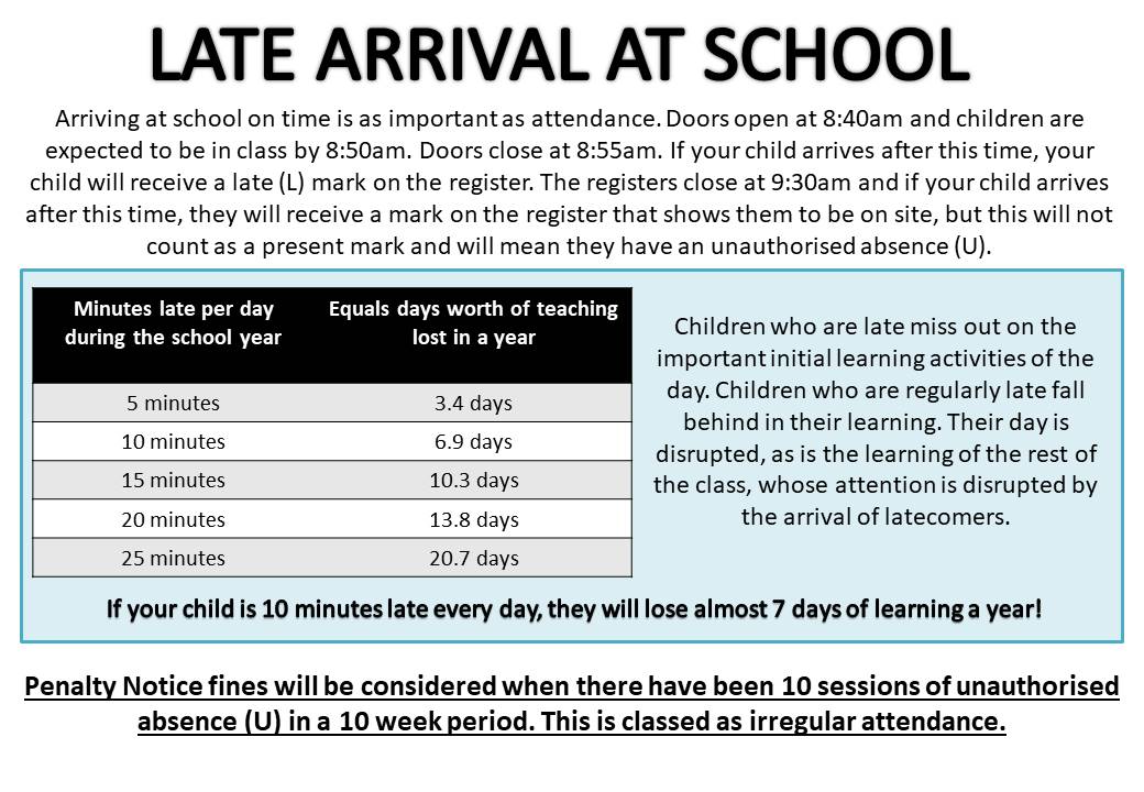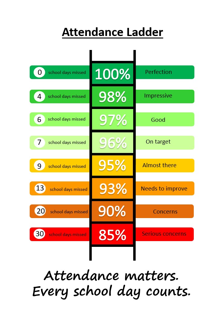 There is a clear link between attendance and achievement. Whenever a child misses school, they miss out on important learning. This time can never be caught up. Regular attendance is the most important factor in a child reaching their full potential. 90% attendance actually means that your child has been away from school for half a day every week! If your child has 90% attendance for a whole year, that means that they have had 4 whole weeks off school in a year. That equates to 20 days or 80 lessons.